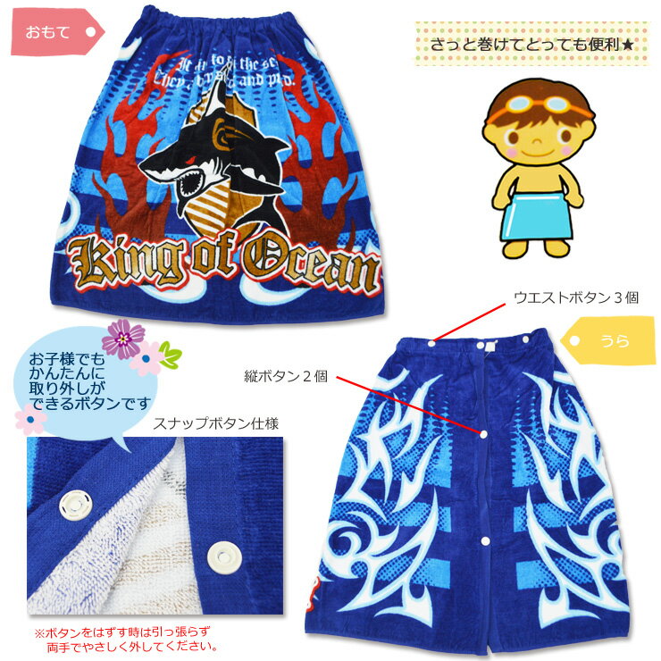 着替え時、海やプール、お風呂上がりに便利! ●肌触りの良い綿100% ●吸水性にすぐれています ●スナップボタン仕様 ●ウエストボタン2段階サイズ調節可能 ●ゴム入りギャザー付き 配送 ※こちらの商品は宅配便送料無料でお届けします。